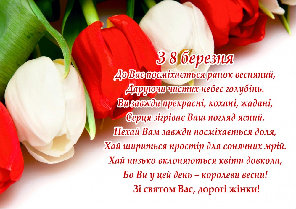 Вітаємо всіх жінок з чудовим весняним святом 8 Березня! Хай над вашою головою буде мирне небо, а серце турбують тільки позитивні емоції. Впевненість у собі, затишне родинне гніздечко, здорові та самодостатні члени сім’ї — нехай все це буде у вашому житті. Зі святом, дорогі наші!